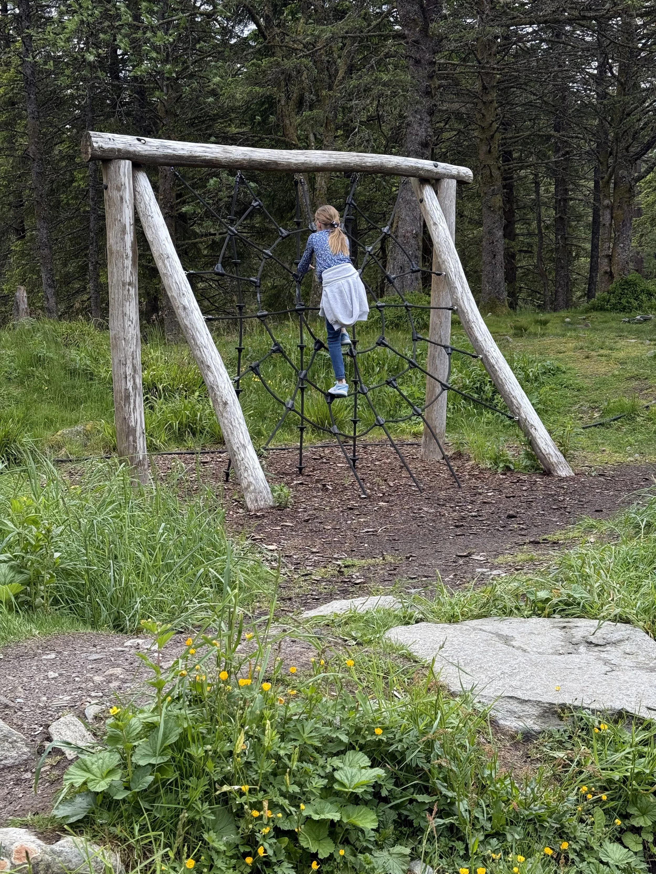 At the top, the view was spectacular—panoramic sights of Bergen, the harbor, and the surrounding mountains. We spent time exploring the Fløyen playgrounds. We checked out the giant troll sculptures, climbing structures, and the obstacle courses in the Troll Forest and Nature Playground. Girls loved the swing the most.